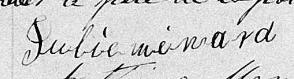 Elle est aussi connue sous le nom de Julie Menard 1, 2. Elle est aussi connue sous le nom de Julie Mesnard 3, 4. Elle est baptisée Julie Ménard 5, 6, 7, 8, 9, 10, 11. Elle est la fille de Simon Menard 5, 6, 7 et Marie Joseph Lévreau 5, 7. Elle est la filleule de Julie Laberge 5 et François Ménard 5.
