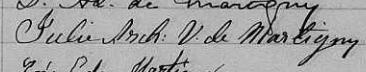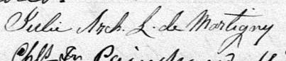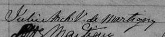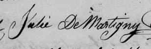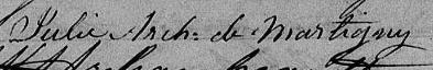 Elle est aussi connue sous le nom de Julie Archambault 1. Elle est aussi connue sous le nom de Dame Julie Archambault 2, 3, 4. Elle est aussi connue sous le nom de Dame Julie Lemoyne De Martigny née Archambault 5. Elle est aussi connue sous le nom de Dame Julie Archambault De Martigny 3. Elle est aussi connue sous le nom de Julie Archambeault veuve de Martigny 6. Elle est aussi connue sous le nom de J. Archanmbeault Ve de Martigny 7. Elle est aussi connue sous le nom de Julie Archambeault 8. Elle est aussi connue sous le nom de Dame Julie Archambeault 9. Elle est aussi connue sous le nom de Julie de Martigny 10. Elle signe Julie De Martigny 2. Elle signe Julie Arch. de Martigny 5. Elle signe Julie Arch. V. de Martigny 3, 6. Elle signe Julie Arch. L. de Martigny 9. Elle est la fille de Amable Archambault et Marie-Anne Bourgault.