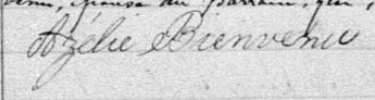 Elle est aussi connue sous le nom de Auzélie Bienvenü 1. Elle est aussi connue sous le nom de Azilie Bienvenu 2, 3, 4, 5, 6, 7, 8, 9. Elle est aussi connue sous le nom de Azélie Bienvenu 3, 7, 10, 11, 12, 13, 14, 15, 16, 17, 18, 19, 20, 21, 22, 23, 24, 25. Elle est aussi connue sous le nom de Asilie Bienvenu 12. Elle est aussi connue sous le nom de Azilie Choquet 26, 27. Elle est aussi connue sous le nom de Azelie Bienvenue 28. Elle est aussi connue sous le nom de Azalie Bienvenu 29. Elle est aussi connue sous le nom de Azilie Bienvenue 30. Elle est aussi connue sous le nom de Azelie Bienvenu 31. Elle est baptisée Marie Osillia Bienvenue 32. Elle est aussi connue sous le nom de Marie Auzilie Bienvenu 33. Elle est la fille de Hypolithe Bienvenu 3, 32, 33 et Céleste Brunel 3, 32, 33. Elle est la filleule de Julie Jaret 32 et Louis Fontaine 32.