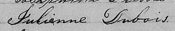 Elle est aussi connue sous le nom de Julienne Dubois 1. Elle est baptisée Julienne Quintin 2.