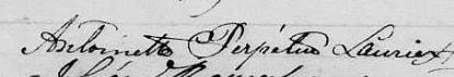 Elle est aussi connue sous le nom de Antoinette Perpétue Lorier 1, 2. Elle est aussi connue sous le nom de Antoinette Perpetue Laurier 3, 4, 5, 6. Elle est aussi connue sous le nom de Perpétue Lauriers 7. Elle est aussi connue sous le nom de Dame Antoinette Perpetue Laurier 8. Elle est aussi connue sous le nom de Dame Antoinette Perpétue Laurier 9, 10, 11. Elle signe Antoinette Perpétue Laurier 1, 12, 13, 14, 15, 16, 17, 18, 19, 20, 21. Elle signe A Perpétue Laurier 7. Elle signe Perpétue Laurier 10.