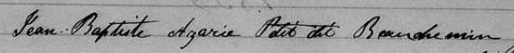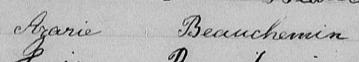 Il est aussi connu sous le nom de Jean Baptiste Arani Petit 1. Il est aussi connu sous le nom de Azarie Beauchemin 2, 3, 4, 5, 6, 7, 8, 9, 10, 11, 12, 13, 14, 15, 16, 17, 18, 19, 20, 21, 22, 23, 24, 25, 26, 27, 28, 29, 30, 31, 32, 33, 34, 35, 36, 37, 38, 39, 40, 41, 42, 43, 44, 45, 46. Il est aussi connu sous le nom de Jean Baptiste Asarie Petit dit Beauchemin 47. Il est baptisé Jean Baptiste Azarie Beauchemin 48. Il signe Jean Baptiste Azarie Petit 1, 47, 49. Il signe Jean Baptiste Azarie Petit dit Beauchemin 47, 49. Il est le fils de Charles Petit 21, 24, 48, 49 et Lucie Geoffrion 48, 49. Il est le filleul de Louise Savaria 48 et Jean Baptiste Raimond 48.