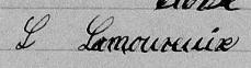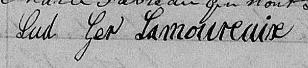 Il signe L Lamoureux 1. Il est aussi connu sous le nom de Ludger Lamoureux 1, 2, 3, 4, 5, 6, 7, 8. Il est le fils de Jacques Lamoureux 2, 3 et Marie Josephte Salmane 3.