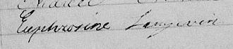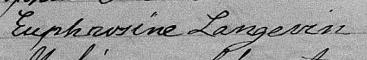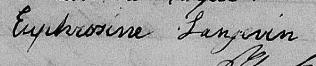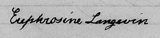 Elle est aussi connue sous le nom de Euphrosine Langevin 1, 2, 3, 4, 5, 6, 7, 8, 9, 10, 11, 12, 13, 14, 15, 16, 17, 18, 19, 20, 21, 22, 23, 24, 25, 26. Elle est aussi connue sous le nom de Uphonsie Choquet 27. Elle est baptisée Marie Euphrosine Langevin 28.