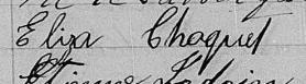 Elle est aussi connue sous le nom de Eliza Choquet 1, 2, 3, 4. Elle est aussi connue sous le nom de Eliza Choquette 5. Elle est baptisée Elisa Choquet 6, 7. Elle est la fille de Joseph Choquet 3, 4, 6 et Marie Eulalie Choquet 3, 6. Elle est la filleule de Lucie Beauregard 6 et Nicolas Bordua 6.