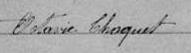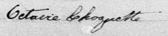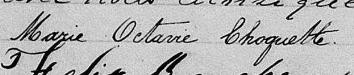 Elle est aussi connue sous le nom de Octavie Choquette 1, 2. Elle est aussi connue sous le nom de O. Choquet 3. Elle est aussi connue sous le nom de Octavie Choquet 2, 4, 5. Elle est baptisée Marie Octavie Choquet 6, 7. Elle signe Marie Octavie Choquette 7. Elle est la fille de Henri Choquet 2, 6 et Delphine Laurent 2, 6. Elle est la filleule de Archange Jodoin 6 et Hubert Choquet 6.