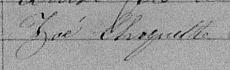 Elle est aussi connue sous le nom de Zoé Choquette 1, 2, 3, 4, 5, 6, 7, 8. Elle est aussi connue sous le nom de Zoé Choquet 4, 9, 10, 11, 12, 13, 14. Elle est aussi connue sous le nom de Z. Choquet 15. Elle est aussi connue sous le nom de Zoë Choquet 13. Elle est aussi connue sous le nom de Zoë Marie Anathalie Choquet 2. Elle est baptisée Marie Zoé Anathalie Choquet 16. Elle est la fille de Henri Choquet 13, 16 et Delphine Laurent 13, 16. Elle est la filleule de Anathalie Trudel 16 et Amable Choquet 16.
