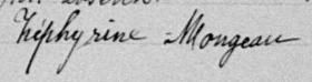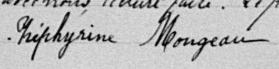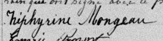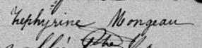 Elle est aussi connue sous le nom de Zéphirine Mongeau 1, 2, 3. Elle est aussi connue sous le nom de Zephérine Mongeau 4. Elle est aussi connue sous le nom de Zéphirine Provost 5. Elle est aussi connue sous le nom de Zéphérine Mongeau 6, 7, 8. Elle est baptisée Marie Zéphirine Mongeau 9. Elle signe Zéphyrine Mongeau 1, 2, 3. Elle signe Zephyrine Mongeau 6. Elle est la fille de Jean Baptiste Monjeau 9 et Lucie Petit 9. Elle est la filleule de Lucie Mongeau 9 et Jean Baptiste Provost 9.