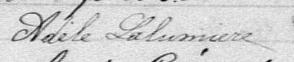 Elle est aussi connue sous le nom de Marie Adèle Petit dite Lalumière 1. Elle est aussi connue sous le nom de Adèle Girard 2, 3. Elle est baptisée Adèle Lalumière 4, 5, 6, 7, 8, 9, 10, 11, 12, 13, 14, 15, 16, 17, 18, 19, 20, 21, 22, 23, 24, 25, 26, 27, 28, 29. Elle signe Marie Adèle Lalumière 1. Elle signe Adèle Lalumiere 8, 30. Elle est la fille de Francois Xavier Petit 1, 4, 6 et Sophie Beaudry 1, 4, 6. Elle est la filleule de Apolline Chappu 4 et Joseph Pilet 4.