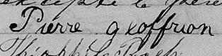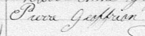 Il est aussi connu sous le nom de Pierre Geoffrion fils 1. Il est baptisé Pierre Geoffrion 1, 2, 3, 4, 5, 6, 7, 8, 9, 10, 11, 12, 13, 14, 15, 16, 17, 18, 19, 20, 21, 22, 23, 24, 25, 26. Il signe Pierre Geofrion 9. Il est le fils de Pierre Geoffrion 2, 6, 9 et Marie Céleste Mongeau 2, 9. Il est le filleul de Dorothée Jodouin 2 et Louis Geoffrion 2.