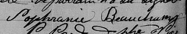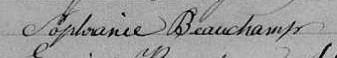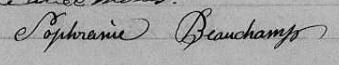 Elle est aussi connue sous le nom de Sophronie Beauchamp 1, 2, 3, 4. Elle est aussi connue sous le nom de Sophronie Philomène Beauchamp 5. Elle est baptisée Soffronie Philomène Beauchamp 6. Elle signe Sophranie Beauchamp 1, 2, 5. Elle signe Sphranie Beauchamp 4. Elle est la fille de Pierre Felix Beauchamp 5, 6 et Marguerite Bachan dite Saint-Pierre 5, 6. Elle est la filleule de Antoinette Perpétue Lorier 6 et Joseph Léon Beauchamp 6.