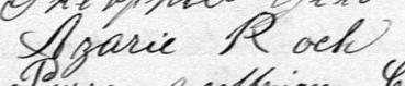 Il est aussi connu sous le nom de Azarie Rock 1, 2. Il est aussi connu sous le nom de Azarie Roch 3, 4, 5, 6, 7, 8, 9, 10, 11, 12, 13, 14, 15, 16, 17, 18, 19, 20, 21, 22, 23, 24, 25, 26, 27, 28, 29, 30, 31, 32, 33, 34, 35, 36, 37, 38, 39, 40. Il est baptisé Marie Roch 41. Il est le fils de Louis René Roque 5, 41 et Julie Brunelle 5, 41. Il est le filleul de Emélie Girard 41 et Louis Brunelle 41.