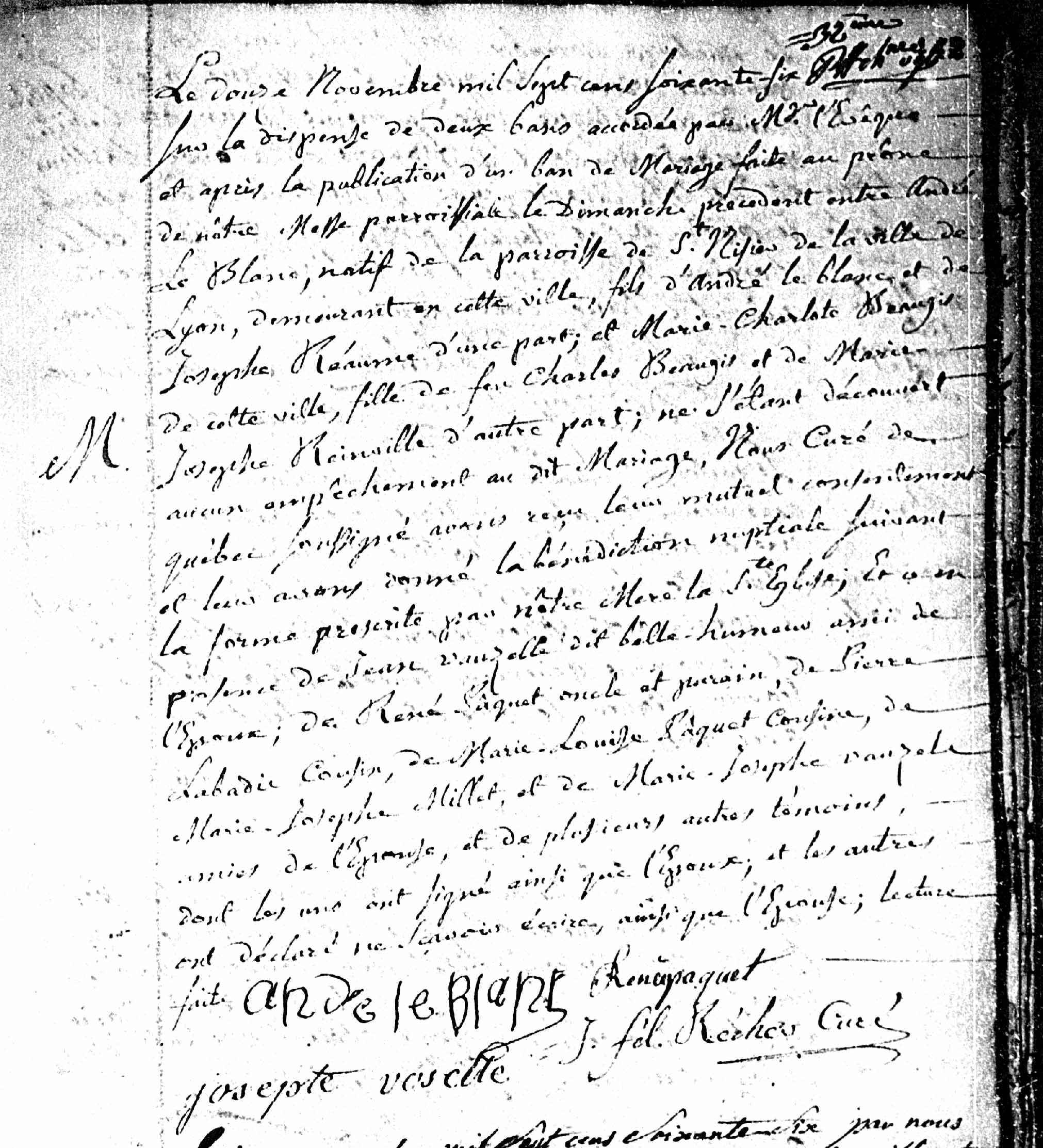 . Elle épouse Sieur André Le Blanc fils de Josèphe Réaume et André Leblanc le 12 novembre 1766 à Notre-Dame, Québec , le mariage est célébré par Jean-Félix Récher 2, 3, 6