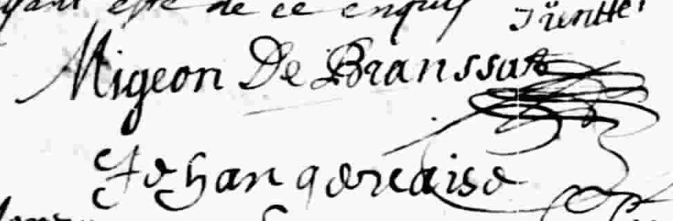 Il est présent lors du mariage de Étiennette Alton et Barthélémy Vinet dit Larente célébré par Gilles Peror le 13 juin 1672 à Montréal 3, 18, 21. Sieur Jean Baptiste Migeon de Branssat est témoin du futur au contrat de mariage de et le 2 novembre 1676 à sur l' ile de Montréal 1, a.