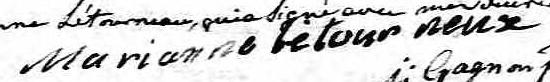 Elle est aussi connue sous le nom de Marie Anne Letourneau 1, 2, 3, 4, 5, 6. Elle est aussi connue sous le nom de Marie Anne Létourneau 7. Elle est aussi connue sous le nom de Marie Anne L' Etourneau 8. Elle est aussi connue sous le nom de Marie-Anne Letourneau. Elle est aussi connue sous le nom de Mari-Anne Létourneau 9, 10, 11, 12, 13, 14, 15, 16, 17. Elle est aussi connue sous le nom de Mari-Anne Letourneau 18. Elle est aussi connue sous le nom de Marianne Létourneau 17, 19, 20, 21, 22, 23, 24. Elle est aussi connue sous le nom de Dame Marian Létourneau 25. Elle est aussi connue sous le nom de Dame Mari-Anne Létourneau 22, 26, 27, 28. Elle est aussi connue sous le nom de Dame Marianne Létourneau 29, 30, 31. Elle est aussi connue sous le nom de Dame Marisnne Létourneau 32. Elle est aussi connue sous le nom de Dame Marie Anne Létourneau 33. Elle signe Mari Anne Létourneau 3, 28, 34. Elle signe Mari An Létournau 4. Elle signe Marianne Mari Ane Tourneux 10. Elle signe Marianne Létourneux 14, 21, 23. Elle signe Mérianne Létournaux 25. Elle signe Mari Anne Létourneaux 15. Elle signe Mari Ane Létournaux 29. Elle est aussi connue sous le nom de Marie-Anne Létourneau 35. Elle est la fille de Joseph Létourneau et Marie-Anne Crépeau.